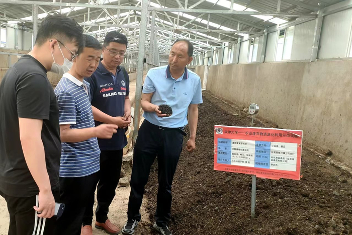 天津大学师生在有机肥厂指导发酵鸡粪与菌菇渣