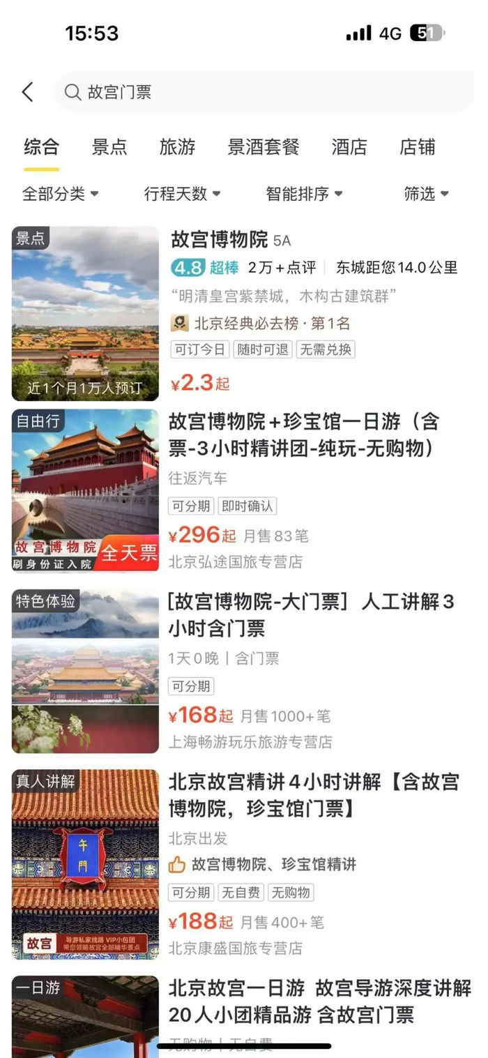记者继续以“故宫讲解不含门票”为关键词进行搜索,发现最低68元即可在旅行社买到讲解服务,这样换算下来,“200元+”的旅行社普遍报价中,代抢门票的支出还是占了大头。