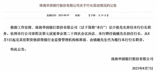 87日,华润银行公告称,根据工作安排,宗少俊辞任该行行长职务。依照该行公司章程及第七届董事会第二十四次会议决议,聘任钱曦担任行长,从85日起至其任职资格获得银行业监督管理机构核准前,由钱曦代为履行行长职责。