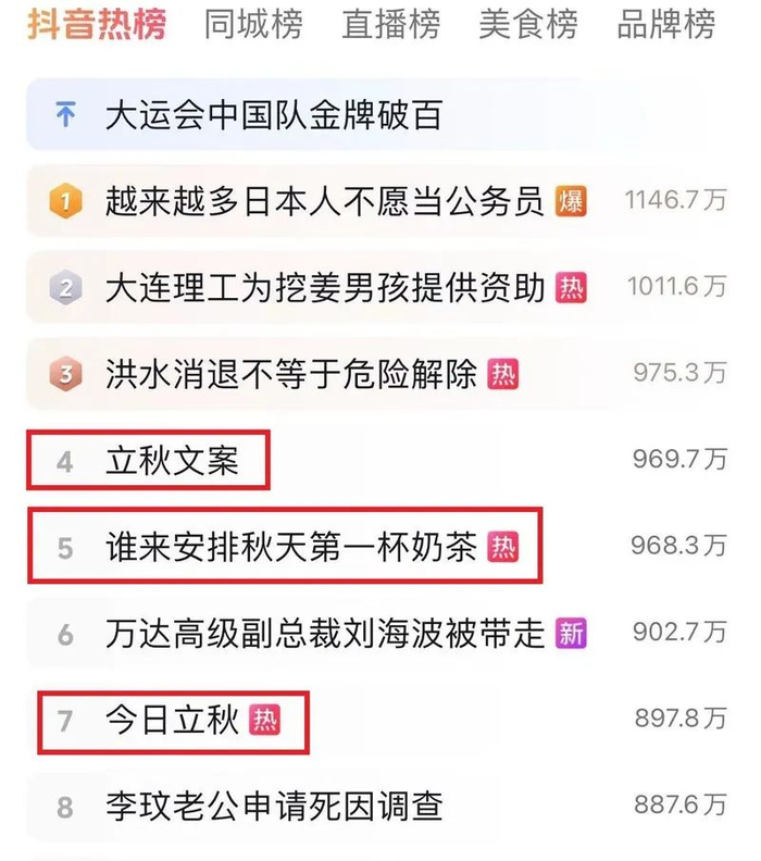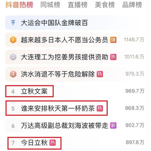 在社交平台热榜上,与立秋相关三个话题进入前10,排在最前面的竟是“立秋文案”。通过这一关键词搜索,人们可以轻松获取立秋相关的文字、图片乃至视频和背景音乐,“搬运”至自己的社交媒体账号。