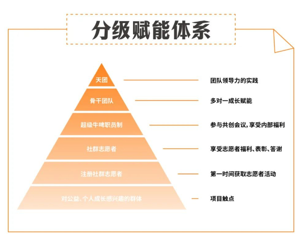 根据活动参与度及群内话题讨论活跃度等数据综合评选,将业主划分为6个层级,分别为“新群员”“注册社群志愿者”“社群正式志愿者”“超级牛啤志愿者”“KOL预备成员”以及“社群KOL”,由阶梯式的金字塔组成完善的成员身份体系。