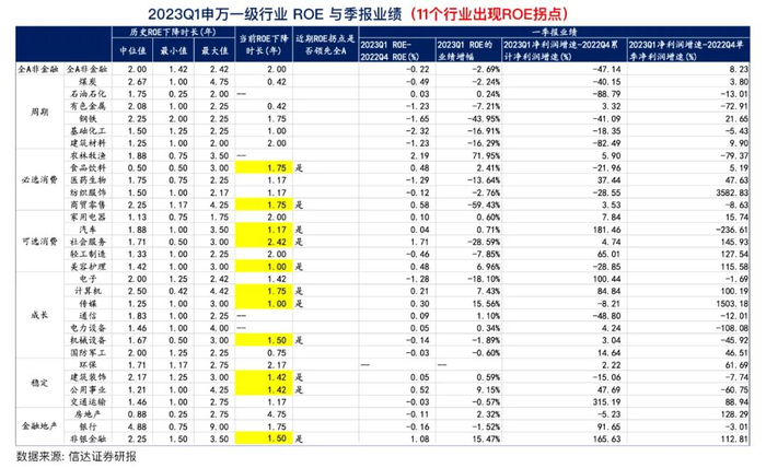 从已经披露的2023Q1季报来看,有11个行业ROE出现拐点,分布于必选消费(食品饮料、商贸零售)、可选消费(汽车、社会服务、美容护理)、成长板块(计算机、传媒)、周期板块(建筑装饰、公用事业、非银金融)。其中,计算机和传媒今年表现出色,“牛市旗手”券商最近才有所动作,而食品饮料、汽车等其它板块还处于行情蛰伏中。