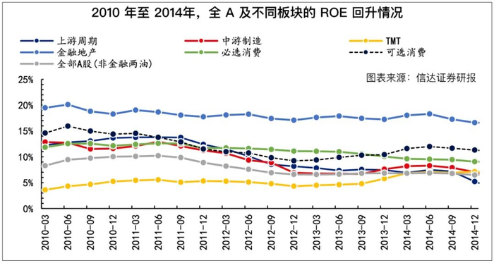 比如,2013年末-2014年末,ROE出现上行拐点后一年,电力设备、建筑材料、公用事业、汽车、非银金融行业的ROE分别提升5.78%、4.15%、3.77%、3.04%、2.96%,其中大多数板块2014年涨幅领先。