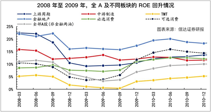 比如,2008年(熊市)转2009年(牛市)期间,盈利改善较为领先的行业,主要集中在消费、金融地产、上游周期板块,盈利改善较为滞后的行业,主要集中在成长板块与中游制造板块。