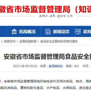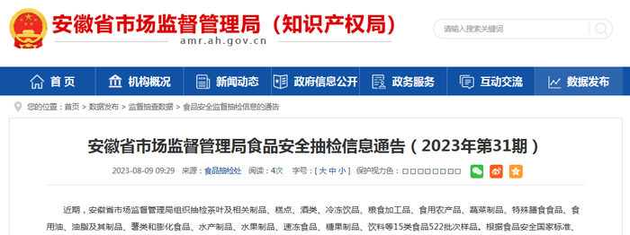 中国质量新闻网讯 2023年8月9日,安徽省市场监督管理局网站发布食品安全抽检信息通告(2023年第31期)。