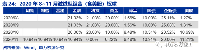 美国方面,经济预期转正,对应提高美股收益预期、降低黄金收益预期;流动性宽松,战术上看好美股和黄金。结合风险偏好后,含美股组合的今年8~11月的配置权重如下: