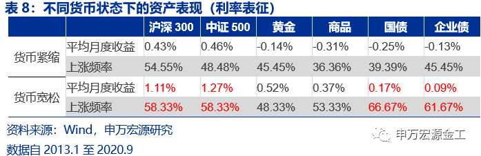2014年下半年的上涨中,短端利率与A股呈现高度相关,此现象一定程度上反映了A股投资者对宏观流动性的关注也从货币的量逐步转向了货币的价。为了利用流动性与资产的关系,我们以1年期国债收益率、1年信用债收益率、10年期国债收益率与各自12个月均线的关系构建宏观流动性的市场表征指标:3个指标至少2个低于均线时视为流动性宽松,否则视为流动性收紧,两种状态下各资产2013~2020年9月的平均月度收益、月度上涨概率如下: