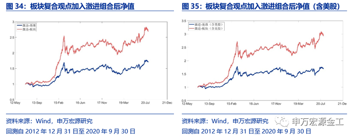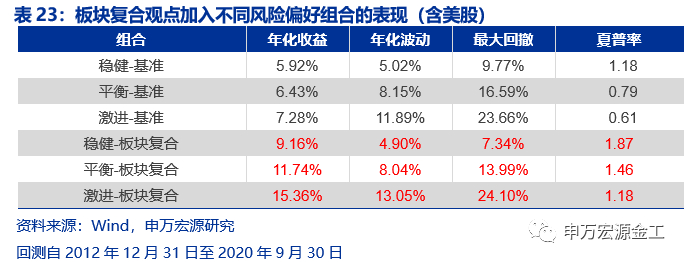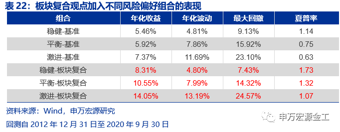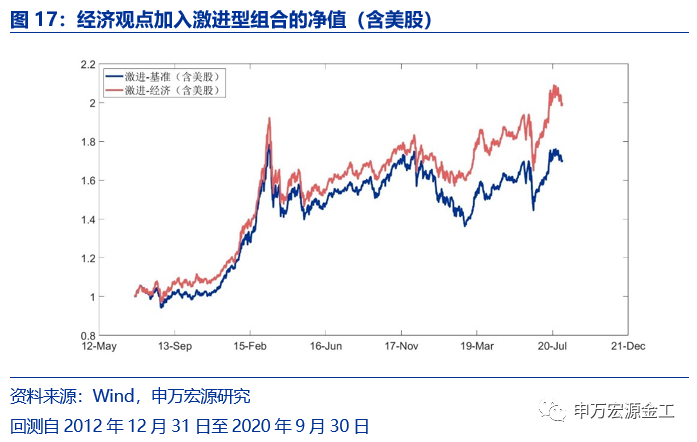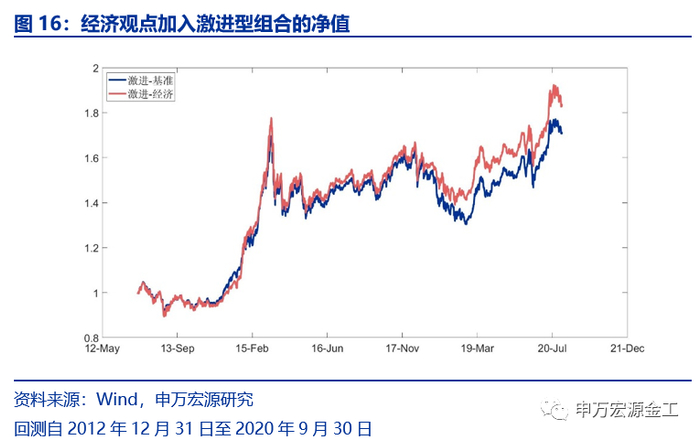 加入对板块的轮动判断后,组合的绩效有了进一步的提升,激进型组合在风险水平差别不大的情况下,收益几乎都在原来的2倍左右,说明经济预期+流动性这两条贯穿的主线对从大类到板块的战术配置决策有重要意义。