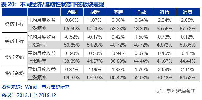 首先,我们观察两个指标分别划分的两种状态下,各板块2013~2019年的表现情况: