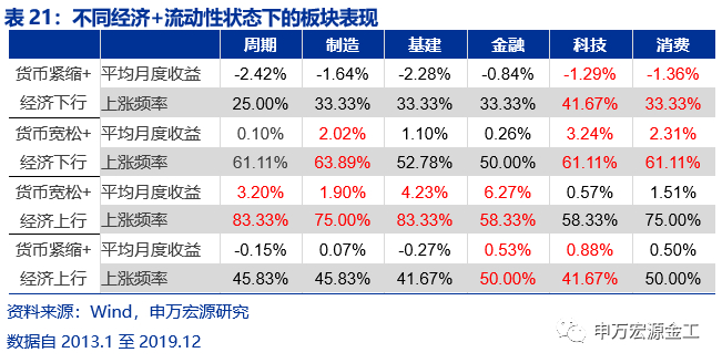 “货币宽松+经济下行”状态下,制造业板块在货币政策的刺激下开始上涨,科技、消费板块表现出色。