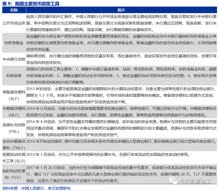 为了更好地执行并传导货币政策,央行自2013年起创设了较多的新型货币政策工具,我国当前货币政策工具包括公开市场业务、存款准备金、中央银行贷款、利率政策、常备借贷便利、中期借贷便利、抵押补充贷款和定向中期借贷便利,其他货币政策工具还包括短期流动性调节工具、临时流动性便利: