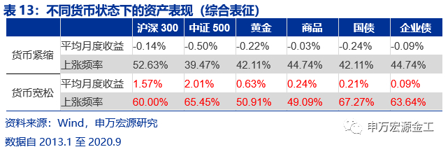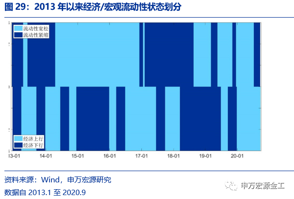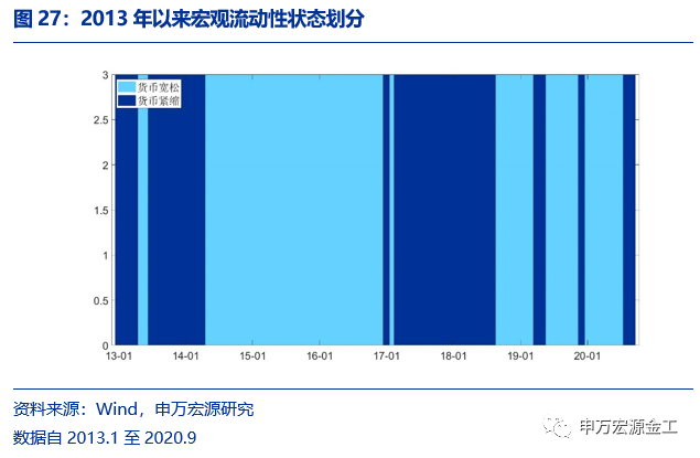相比表8,结合三种信号后,资产在不同货币状态下的收益区分度有了较明显的提升,宏观流动性判断准确性有所增强。2013年以来的宏观流动性状态划分如下: