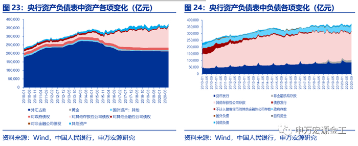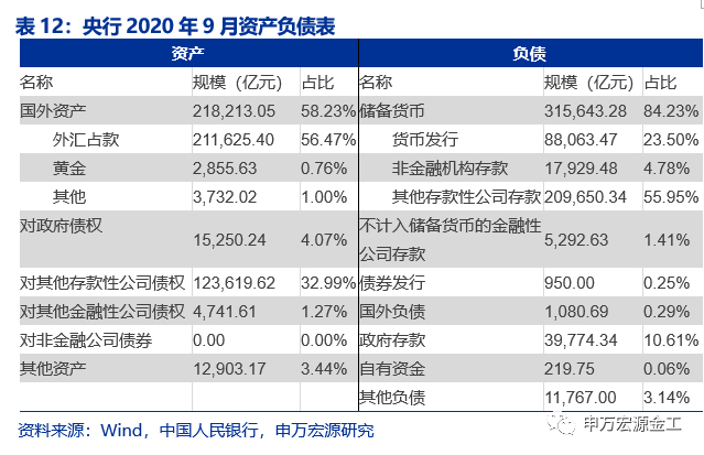 央行的资产负债表共有六个资产大项、七个支出大项,我们列出主要项目名称和其在2020年9月报表中的规模、占比情况: