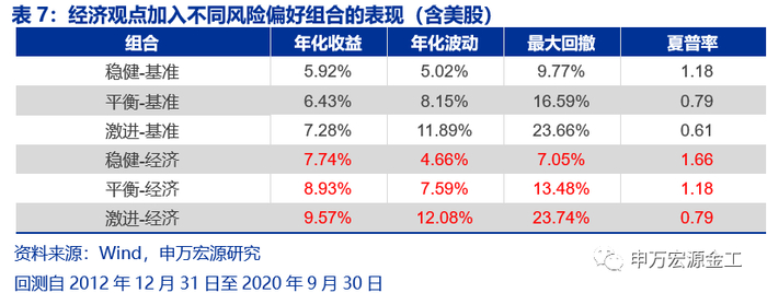 除了以上大类资产,美股也是我们在配置中常用的资产类别,而从前面表1的因子暴露来看,黄金受我国经济的影响也较弱,因此我们尝试使用美国OECD领先指标的方向来判断美国次季度的经济,给出黄金、美股的观点。由于OECD领先指标滞后两个月公布,因此我们使用季度开始前2个月的指标给出信号,指标上行则调高美股预期收益、调低黄金预期收益,结合后的组合表现如下: