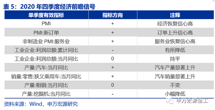 2020年第三季度末,季度经济前瞻信号给出第四季度的信号仍为正,即经济仍将继续复苏,具体的指标情况如下: