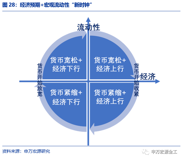 事实上,这两个维度之间本身有着密切的联系:决定流动性的货币政策有较大程度的“主动调整”特征,而其调整与经济状况本身有着密切的联系,这一特征也使得两个维度的结合天然地与时钟相类似:经济上行过程中流动性会预防性地先收紧,经济开始出现下行迹象时流动性也会开始放松,从而形成时钟轮转: