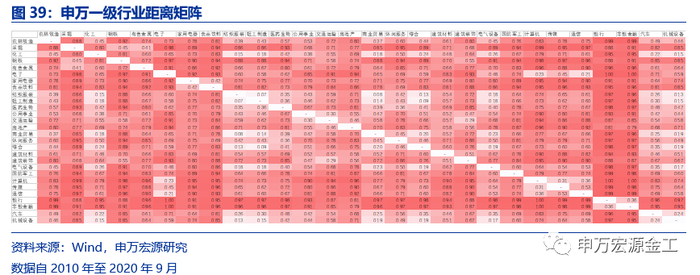 从上面的结构图中看,各行业之间的连接关系较为复杂,除金融(银行、非银金融)、周期(有色金属、采掘、钢铁)、科技(传媒、计算机、电子、通信)单独形成板块较为明确,其他行业之间的聚集关系不明确。我们得到的28个一级行业之间的距离矩阵如下: