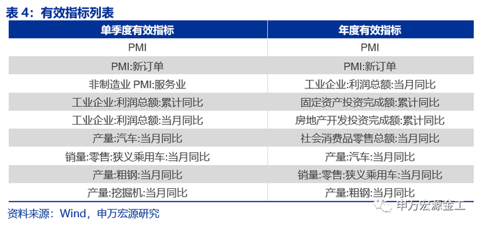此外,在2.1的测试中,我们发现对于债券资产来说,经济数据对其影响更偏向长时间维度:当年度GDP同比变化方向与债券收益方向相反的频率较高。因此,我们也使用类似的量化方式尝试构建年度经济前瞻信号。季度、年度经济前瞻信号的有效指标列表如下:
