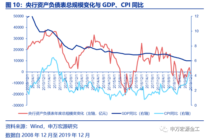 事实上,流动性与资产表现高度相关、取代通胀成为第二大影响因素的现象可能也与央行积极通过货币政策调节经济、通胀有关:在传统的货币方程下,当货币流通速度变化不大时,货币量成为影响经济增长和通胀周期的关键因素。央行希望通过主动的对货币供应量、利率目标的调节达到稳定经济增长、平稳物价的效果,降低经济周期的自发波动,图2经济、通胀数据波动的降低也说明了调节行为的作用。正是在这样频繁的调节参与下,流动性变化逐步成为影响我国资产表现的第二大共同因素。我国央行资产负债表总规模与GDP、CPI同比变化如下: