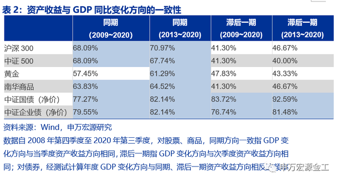 若进一步各资产收益与GDP同比变化方向的一致性,也可以看到二者同期一致性较强,若计算滞后一致性(当季度GDP同比对应次季度资产收益),权益资产的一致性甚至不足50%,说明公布经济数据时其影响往往已经反映在历史收益中,若根据公布数据的方向判断资产表现,方向错误的概率较大: