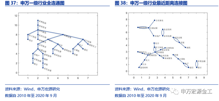 至此,我们将行业之间的关联问题转化为图论中连通网络的问题,我们根据距离绘制行业的全连通图和最近距离连接图如下: