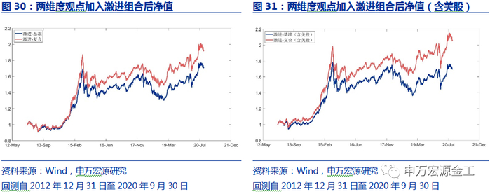 因此,对于经济、流动性两个维度对大类资产的战术观点,我们建议可同时考虑、直接叠加:即分别根据经济、流动性给出资产观点,而不必进行四个象限的处理。在两个维度观点的重要性上,可等权或根据定性的判断进行调整。以我们第二、三节给出的结合风险偏好的激进组合为例,我们将两个维度观点给出的权重直接等权后生成新的组合,组合的风险调整后收益较好:
