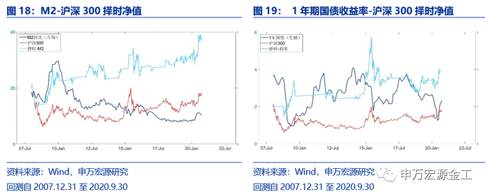 随着货币政策中介目标的转变,对于权益市场来说,我们也发现市场关注的点出现了一定的从货币的量到价的转变:我们以M2、1年期国债收益率指标分别构建信号进行简单的择时测试:当M2同比增速/1年期国债收益率分别高于6个月均线/低于12个月均线时次月持有沪深300,发现市场在2008~2012年的行情中对M2的变化较为敏感,而此后M2同比增速持续回落,市场对利率的敏感程度明显提升: