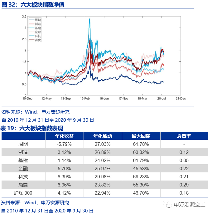 我们对每个板块内的行业指数进行等权合成,每月再平衡,得到六大板块指数,指数自2010年12月31日至今的表现情况如下: