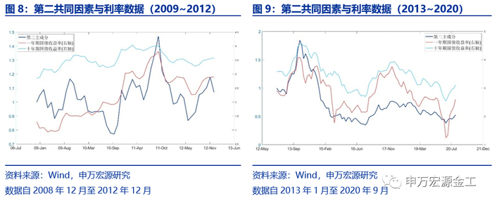 2) 从图9可见,2014年起第二共同解释因素与利率同步快速下行,而A股在该因子上的暴露为负,即A股该阶段的快速上涨由宏观流动性驱动