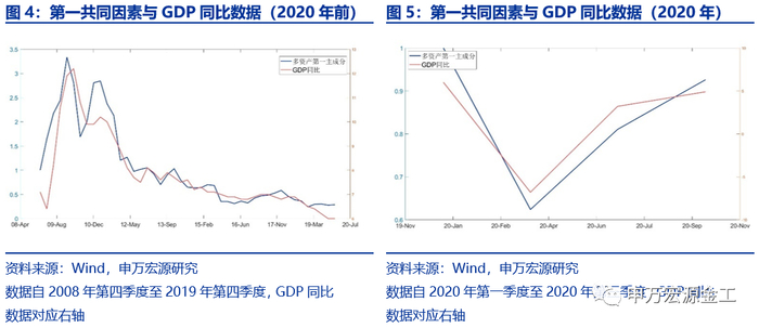 由于2020年受疫情影响的数据和此前波动差别较大,我们将2020年三个季度的数据单独绘制,发现GDP同比数据的变化方向同样与第一主成分波动方向高度一致。整体而言,季频第一主成分对多资产波动的方差解释占比达45%,占据绝对优势,说明我国大类资产波动的第一共同解释因素恰为经济的变化。