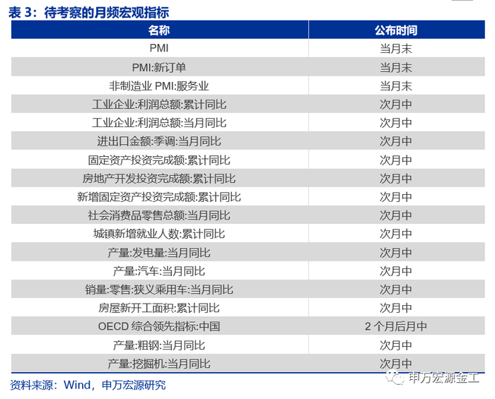 事实上,宏观经济的领先指标无论在宏观领域还是其他领域的研究中都是一个重要的话题,若能找到合适的领先于GDP数据的其他经济高频变量,则我们就能借用前面的结论给出季度的资产配置基础观点。对此,我们结合OECD领先指标中的参考指标和我国宏观数据体系,考察以下关注度较高的月频宏观指标,主要涵盖采购经理调查性指标PMI、工业企业利润、进出口、投资、消费、就业、发电量等生产代表指标、汽车生产销售数据:
