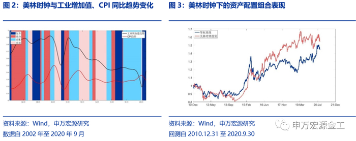 虽然传统的美林时钟基于战术资产选择,桥水著名的全天候策略基于宏观环境对冲思想,两者看待资产配置的角度全然不同,但两者都以经济增长和通胀为核心变量。若我们使用国内的工业增加值同比和CPI同比数据经过HP滤波划分美林时钟,发现2013年以后数据逐渐平稳、时钟难以识别,尤其是在2013年至疫情前数据的波动很小,根据时钟配置股票、商品、债券资产的策略(见附录1)效果也较差: