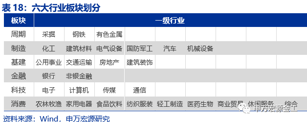 为了观察行业板块在不同宏观环境下的表现,我们首先需要进行一定的板块划分,将更相近的一级行业聚集成更大的板块,以帮助我们把握更宏观级别的行业强弱变化。因此,我们借助聚类的方法进行板块划分(聚类方法及相关图表详见附录3),根据数量化的结果和逻辑判断将28个申万一级行业聚集为六大板块:
