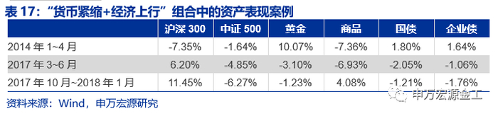 从表格中的数据来看,对权益资产来说,“货币宽松+经济下行”的组合优于“货币紧缩+经济上行”的组合;对债券资产来说,“货币宽松+经济上行”的组合优于“货币紧缩+经济下行的组合”,这说明在过去的中国市场当中,流动性对资产方向的影响往往比经济预期更为重要,依据流动性判断资产方向比依据经济周期的胜率更高。但从具体的情况来看,2014、2017年都曾出现明显的“货币紧缩+经济上行”的组合,但这些时段资产的表现有明显差异,以3个时长4个月的区间为例,资产表现情况如下: