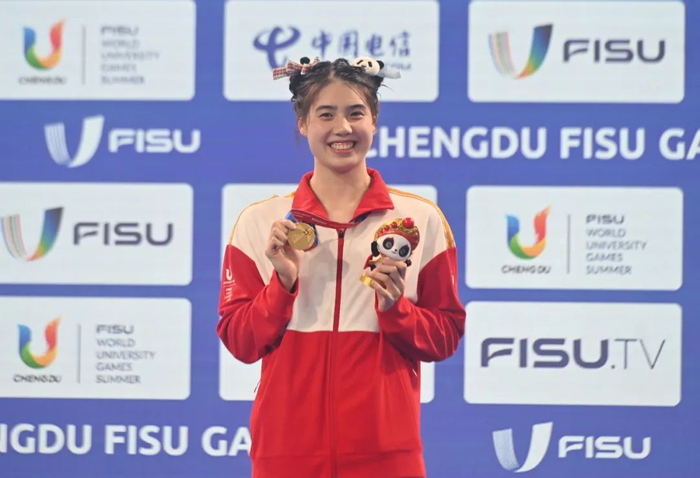 在成都大运会游泳项目最后一天的比赛结束后,张雨霏和她的3名接力队友高举“谢谢成都”的字样来感谢成都,感谢观众。虽然这是张雨霏第一次来到成都,但火锅、大熊猫,以及热情洋溢的成都观众,这座城市给她留下了极为深刻的印象。