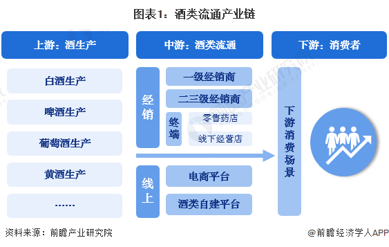 从中国酒类流通的产业链结构来看,行业上游主要为酿酒以及酒类生产行业,中游主要为酒类流通行业企业;下游消费行业主要面向消费者。