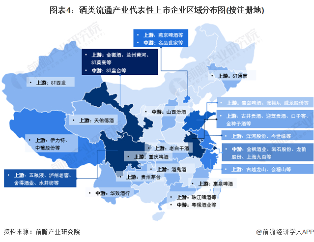 从酒类流通产业链企业的分布来看,上游酒类制造企业主要长三角地区和西部地区;代表性酒类流通行业企业主要分布在上海区域,酒类流通注册企业主要分布在广东、河北、浙江、上海等区域。