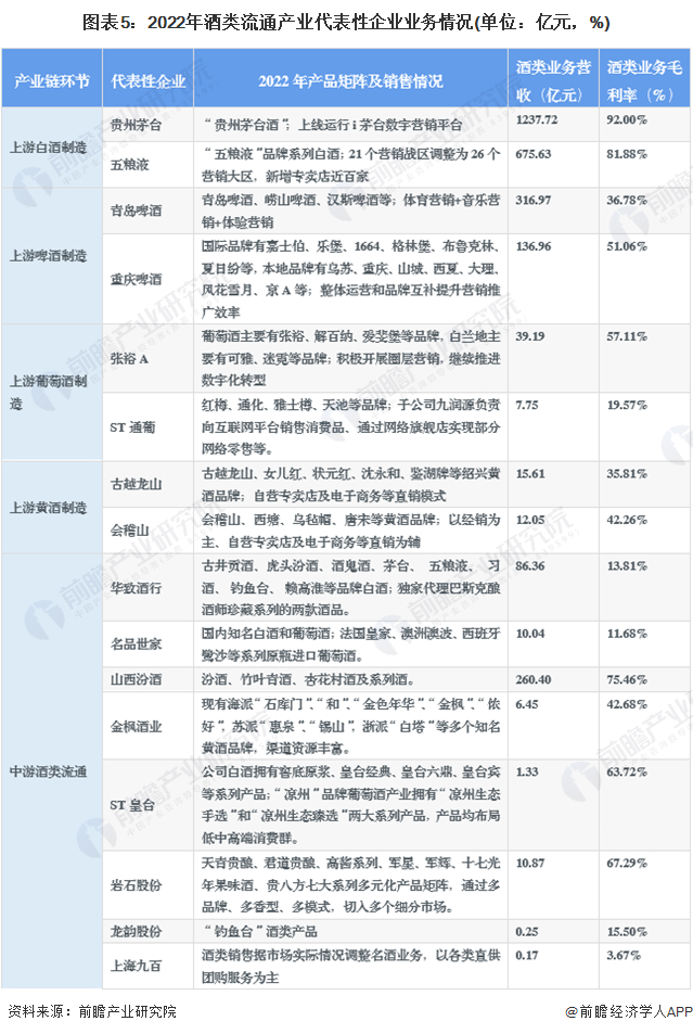 从行业生态图谱来看,中国酒类流通上游酒类生产行业中,茅台、五粮液等厂商在国内行业中处于领先地位,其中白酒的体量相对较大;在产业链中游、酒类流通领域,华致酒行、名品世家、北京糖业等为专注酒类流通运营的企业,山西汾酒、金枫酒业等为产销一体的酒类经营企业。