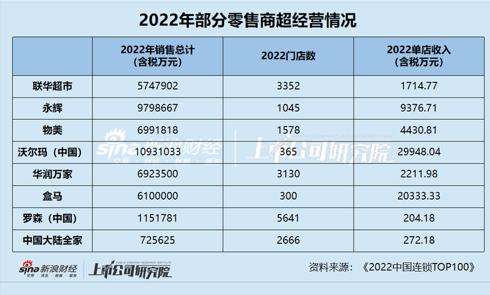 而据《2022中国连锁TOP100》中的数据简单估算,联华超市的门店经营情况或在同行中排在垫底的位置。其平均单店收入仅为1714.77万元,而同期永辉为9376.71万元,物美为4430.81万元,华润万家为2211.98万元,更不用说沃尔玛、盒马等更强竞对。而从便利店方面来看,罗森与全家的平均单店收入也在200万元以上,联华超市的便利店157.97万元的单店收入现在无法与其匹敌。