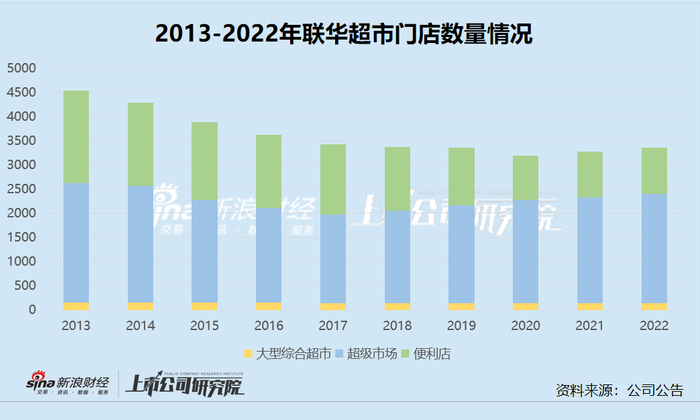 可以看出,近十年来,联华超市都处于陆续关店的状态中。2013年时尚有4530家门店,而到了2022年门店总数仅为3352家。从不同业态门店来看,联华超市的门店类型分为大型综合超市、超级市场与便利店三种,三种业态的超市呈现出了不同程度的减少,其中大型综合超市的关店相对较少,门店数量相对稳定,而超级市场与便利店的数量在近年间则大幅减少。
