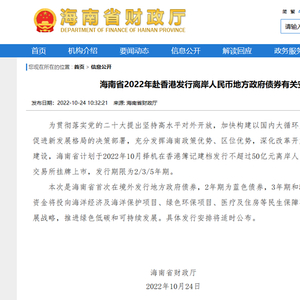 这已不是海南省第一次发行离岸人民币债券,早在去年10月26日,海南省就成功发行共计50亿元的离岸人民币地方债,从海南省财政厅确定债券承销团成员名单,到债券在香港交易所挂牌上市,仅间隔28天。
