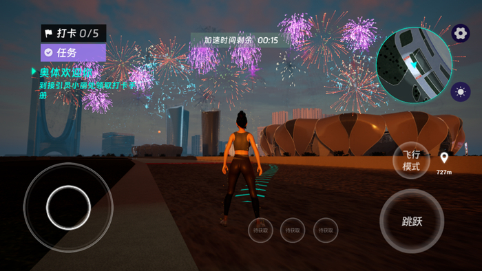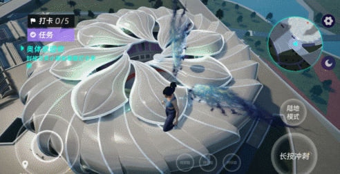 在这里,用户能不受物理和时空的约束自在漫游场馆,还可以收集加速、烟花等道具,以步行或者飞翔的形式漫游园区,观看烟花表演。在移步换景的过程中能从不同角度,更加细致入微地观察场馆精巧的内外结构,甚至一跃而上,从空中观看并体验“小莲花”最为人所称道的“旋转开闭”屋顶设计。