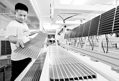 浙江湖州德清县某公司车间内,工人正赶制一批出口光伏产品。光明图片/视觉中国
