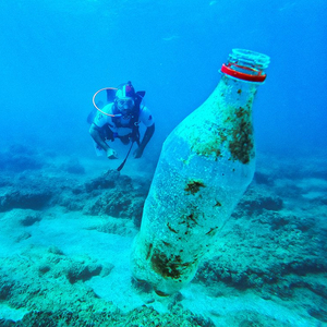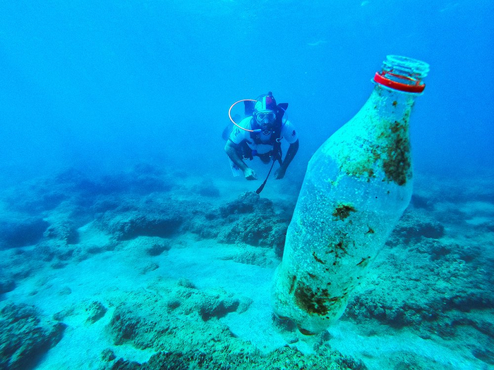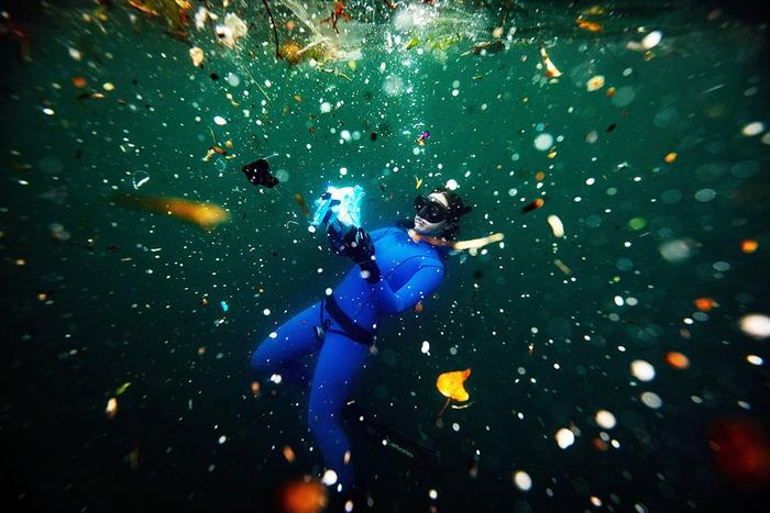 2020年6月27日,土耳其伊斯坦布尔,自由潜水世界纪录保持者萨希卡·埃库门(Sahika Ercumen )在塑料垃圾中潜水,观察博斯普鲁斯海峡的生物和污染,这次潜水是为了提高人们对塑料污染的认识。