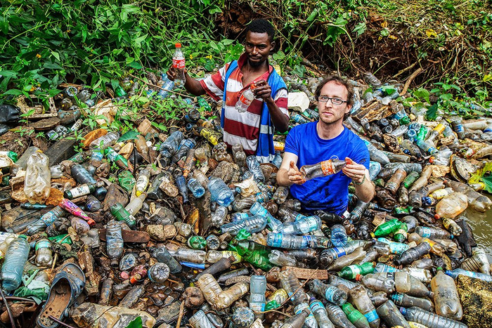 2023年7月8日,肯尼亚内罗毕,德国非营利环保组织Sana Mare的创始人兼首席执行官Lucas Schmitz与一名志愿者一起,在Karura森林附近的Ruaka河收集塑料垃圾。Sana Mare组织在世界各地进行海岸清理和环境教育,以解决海洋污染问题。该组织通过与当地社区合作,特别是在低收入地区,向他们支付津贴,然后在最需要和最难清理的地方进行清理。
