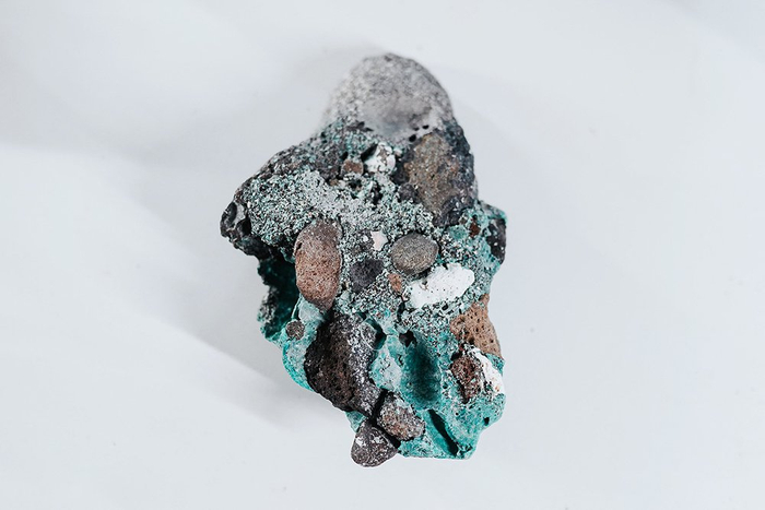 2023年3月22日,巴西库里提巴,巴拉那大学实验室的“塑料岩石”。地球上很少有地方像特林达德岛这样与世隔绝,这是一个火山露头,距离巴西海岸只有三到四天的航程。因此,地质学家Fernanda Avelar Santos惊讶地发现了一个令人不安的迹象,即人类对这片原本未受影响的土地产生了影响:海洋中漂浮的大量塑料污染形成了岩石。