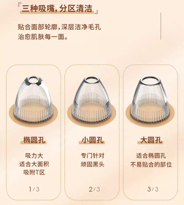5.自带三只功能吸头、三档不同吸力,友好对待不同肤质