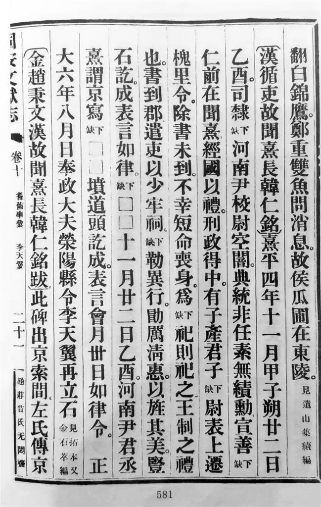 先简单介绍一下石碑内容。墓主人韩仁是个很好的官员:“在闻喜,经国以礼,刑政得中,有子产君子(之风),”因为表现出色,朝廷准备提拔他到槐里任职时,他却不幸去世。负责监察官员的司隶校尉听到消息,命河南尹派官员用“少牢”之礼来祭祀他。以羊、豕各一祭祀叫“少牢”,规格仅低于“太牢”,可见朝廷对韩仁的嘉许。那么这块汉碑怎么就和金代的固安人李天翼发生联系了呢?