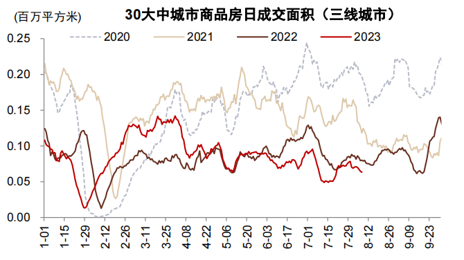 地产敞口担忧再起。7月以来部分房企信用债价格再度下跌,引发市场对银行涉房资产风险的担忧。我们认为新房销售走弱叠加债务到期规模上升是流动性压力的直接来源,我们估算6月-8月(截至8月8日)30大中城市商品房成交面积同比下滑约30%,销售回款为房地产投资第一大资金来源比重,占比56%(TTM);另一方面2023年下半年房地产债券到期也进入高峰,境内房地产债券净融资2023年4月后转负,境外债2021年10月后大多数月份持续净融资为负,房地产现金流压力上升。
