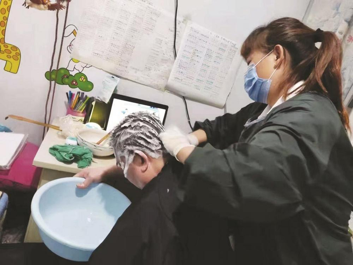 西南庄社区服务人员入户给老年人理发
